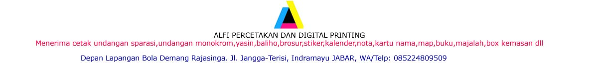 ALFI Toko Kertas dan Percetakan adalah percetakan yang mempunyai konsep Solusi CETAk SATU ATAP karena Tempat Setting, Toko Kertas dan Percetakan berada dalam satu atap sehingga bisa lebih efisien dan bisa selesai dengan cepat sehingga bisa menekan biaya . Percetakan ALFi telah berdiri lebih dari 15 tahun melayani jasa percetakan di indramayu dengan harga yang murah tapi kualitas bisa terjamin bagus. Kami Menerima Jasa cetak berbagai undangan sparasi, undangan offset, undangan Hard Cover, Cetak brosur, Nota/invoice, Cetak Baligho, Bikin Map, Kartu Nama, Label dan lain sebagainya.